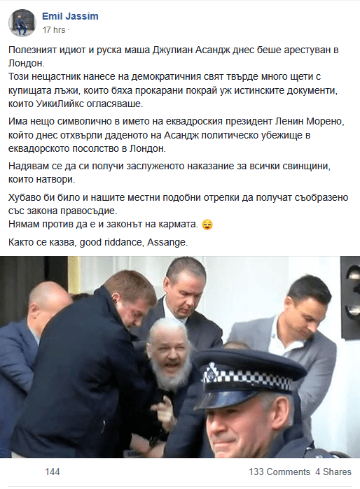 Последният пример от вчера. Джулиан Асанж бе арестуван в Лондон и Емил Джасим реши да пусне изключително грозен и невеж коментар по повода. Учудващо, но преобладаващите коментари, бяха по скоро укоряващи Джасим и в подкрепа на Джулиан. Хората закономерно поискаха обосновка за твърденията на Джасим. Той отговори с пренебрежение и тон, който е под всякаква критика.